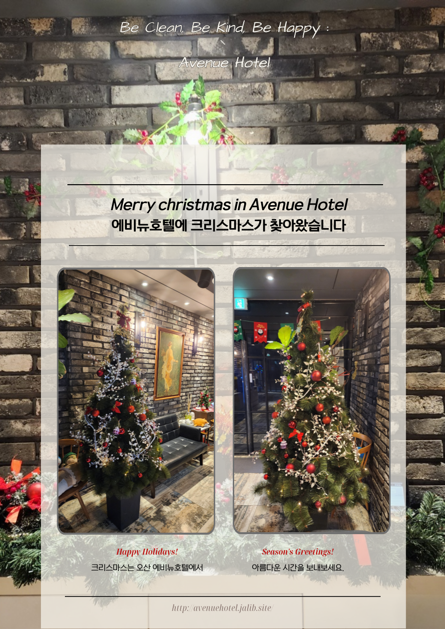 안녕하세요! 아늑함과 따뜻함이 공존하는 오산 [에비뉴호텔] 입니다! 곧 다가오는 크리스마스를 맞아, 저희 오산 에비뉴호텔에서 호텔 로비에 아름다운 크리스마스 트리를 설치했습..